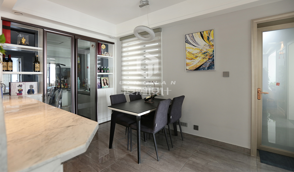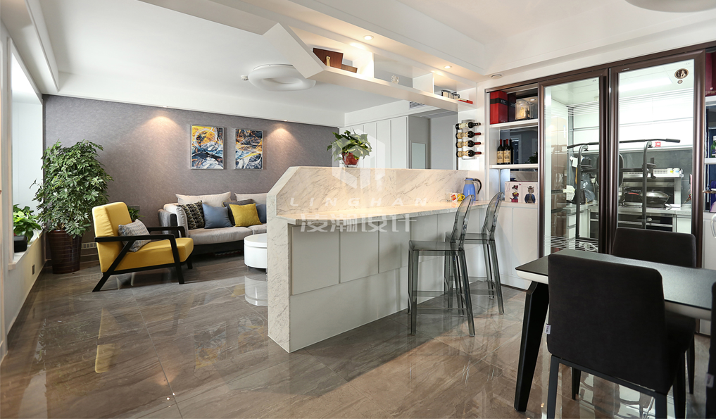 該獨棟別墅裝修設(shè)計以新中式為主,石材和金色的點綴不僅讓新中式風格展現(xiàn)沉穩(wěn),還可以讓居住環(huán)境更高雅,精致。墻面整體大理石的設(shè)計以及銅條的裝飾,使空間盡顯高端、大氣。